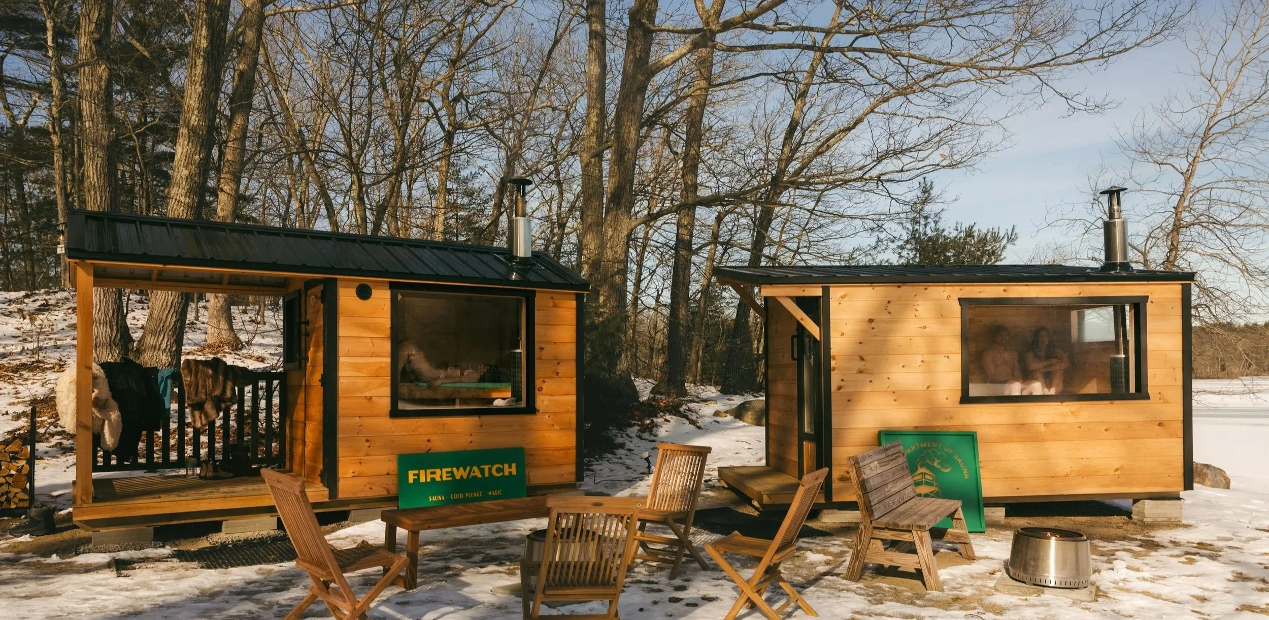 Firewatch is a public, outdoor sauna and cold plunge experience, set in the woods by Noanet Pond.