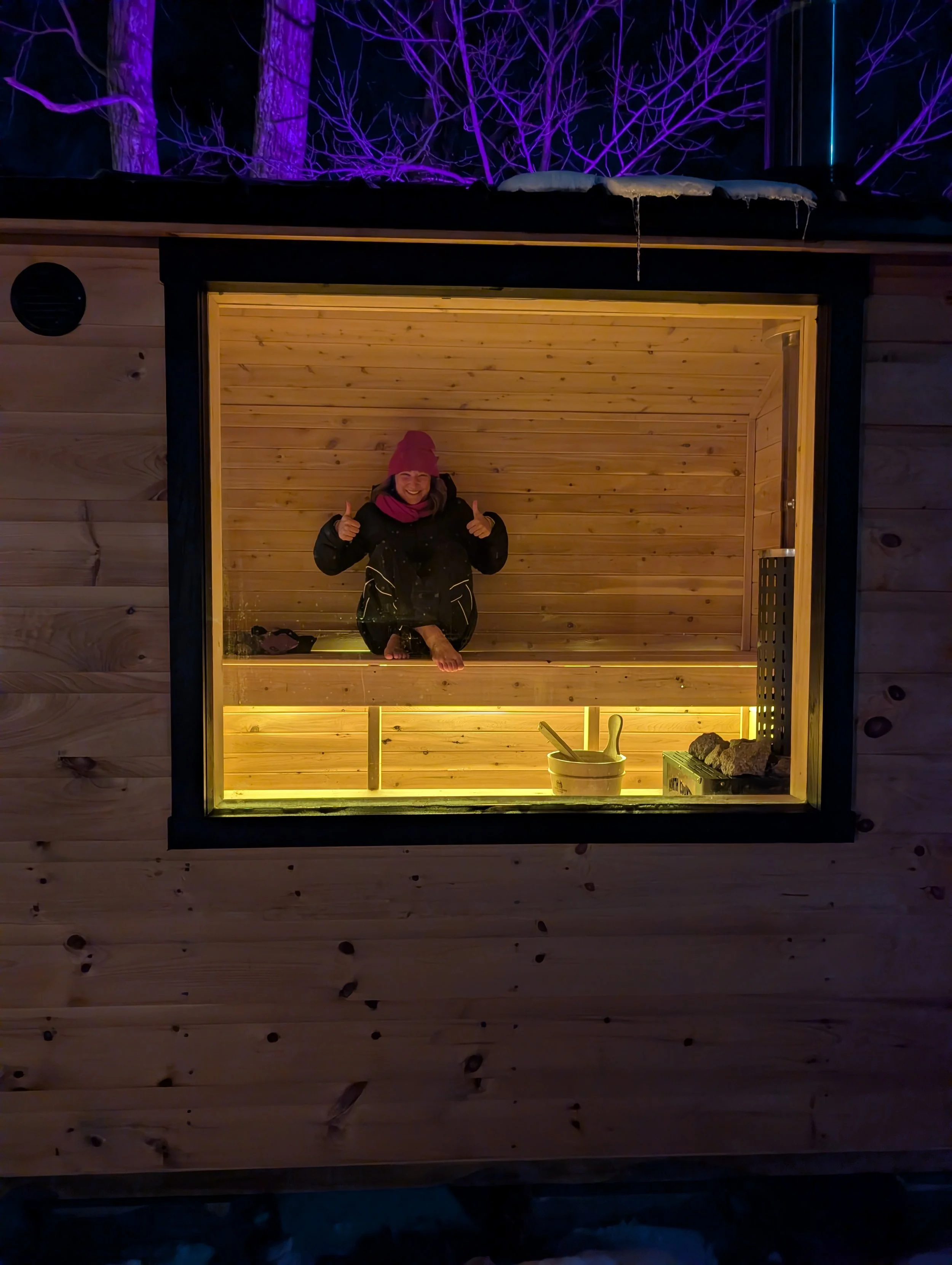 Beautiful night-time lighting for pathways and inside the sauna for evening sessions